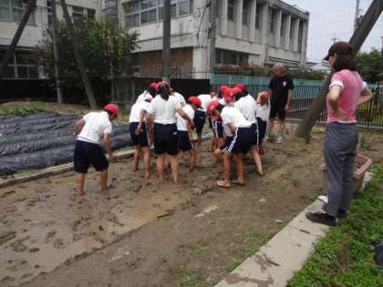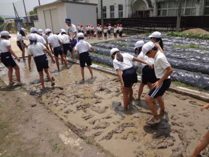 クラス半分に分かれて、水田に入ると、足がめり込んでしまい、「足がぬけない!」「先生!背が縮みました!」などと口々に言いながら、代かきを楽しんでいました。