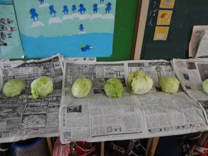 2時間目に地域の方といっしょに収穫したキャベツ。教室の後ろで新聞紙の上にのせられ、持って帰る準備がされていました。