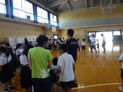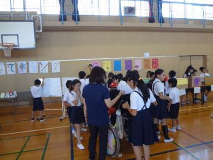 いよいよ班での活動のスタートです。高学年の児童が平野支援学校のお友だちの車椅子を押して、いっしょに回りました。