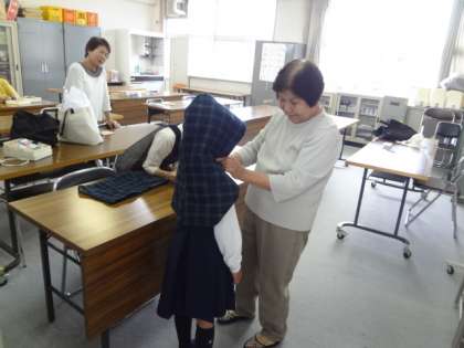 生涯学習ルームの横を通りかかった2年生の児童に、サイズが合うかどうかモデルを頼んでおられました。