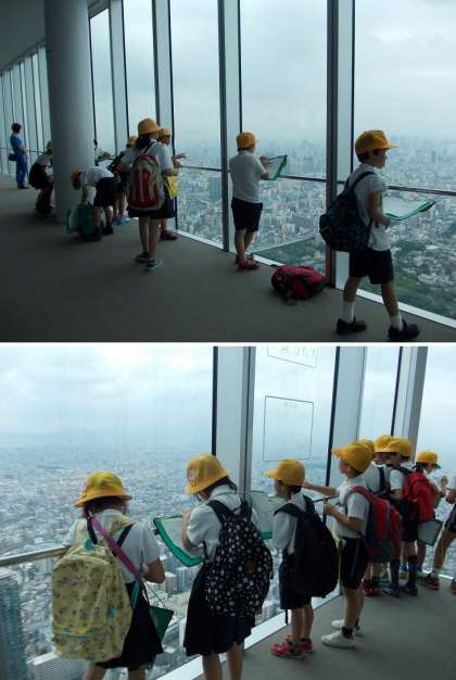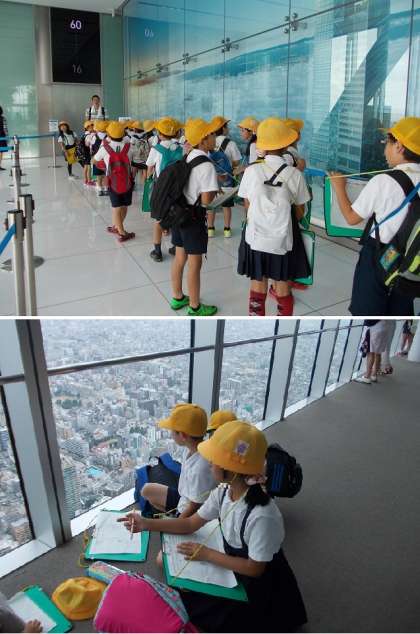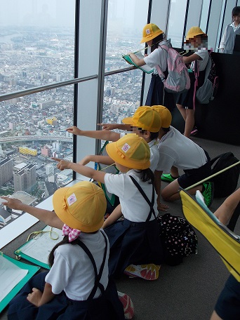 大阪一高いビルあべのハルカスから大阪市内を一望し、教科書や写真ではなく、自分の目で見て市内の様子を学習することができました。