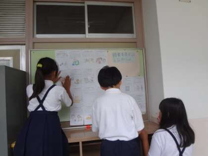 図書委員会で「わたしのすきな本しょうかいします」のポストを開け、図書委員会の掲示板にはる作業をしました。