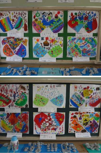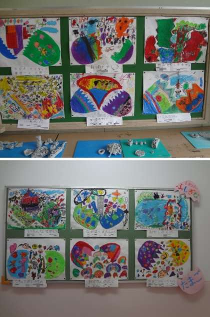 “オルゴール”“おかしのせかい”“おばけやしき”……たまごの中からいろいろなものが出てきます。(1枚目の画用紙にたまごをかき、それを割って2枚目の画用紙にはり、そのたまごを中から広がる世界をえがきました)