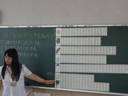 7月1日(金)長吉出戸小学校の田坂先生にお越しいただき、「カルシウムのはたらきを知ろう」というテーマで学習しました。