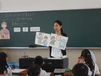 おやつについて考えるとともに、三食のごはんをしっかりと食べることの大切さについて教えていただきました。