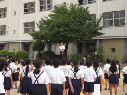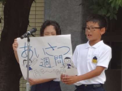 児童朝会でも代表の児童から「あいさつ週間」のお知らせがありました。