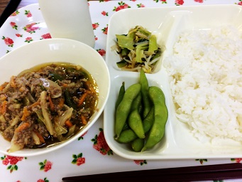 マーボーなす チンゲンサイともやしの甘酢あえ 枝豆