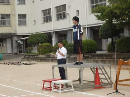 今朝の児童朝会で、校長先生から紹介の後、子どもたちみんなにあいさつをしていました。2週間という短い期間ですが、運動会という大きな行事を通して、子どもたちに深く関わろうとしてくれています。全体練習の合間に、さっそく子どもたちと楽しそうに話をしていました。