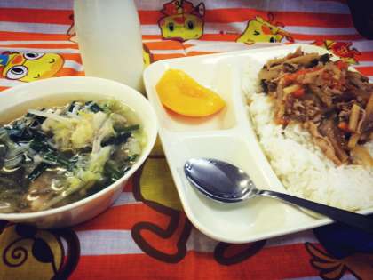 ピリ辛丼 中華スープ 黄桃(缶)