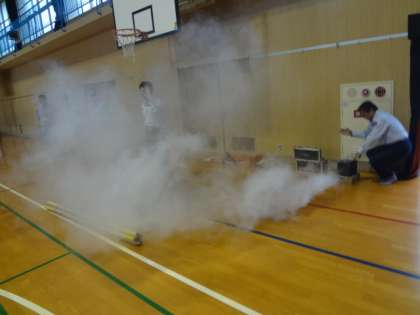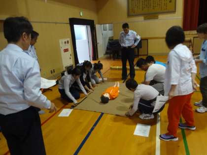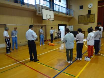 土曜日の学習参観・地域防災訓練に向けて職員の防災訓練講習を行いました。