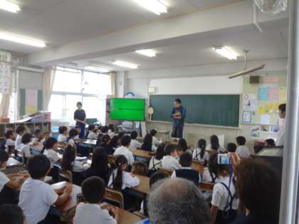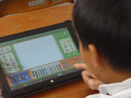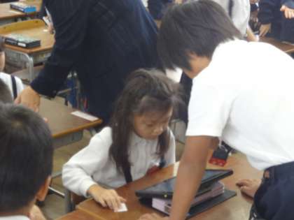 初めて学校のタブレットを使う1年生。ログオンできるかな?と不安でいっぱいでしたが、今日は頼もしい4年生のリトル先生が1年生に一人づつついて、丁寧に教えてくれました。1年生はみんな戸惑うことなくタブレットを使うことができました。