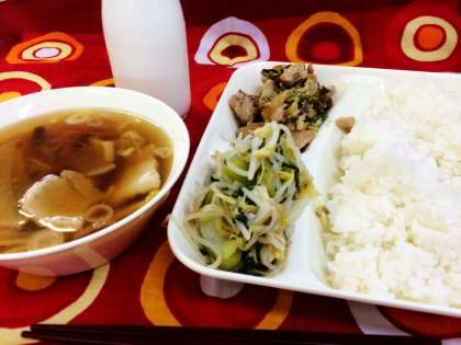 鶏肉のごまだれ焼き ソーキ汁 チンゲンサイともやしの甘酢あえ