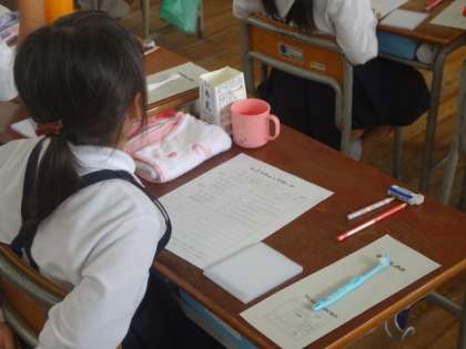 虫歯にならないためにどうすればいいのかを学習し、しっかり歯みがきができているか確認しました。歯に赤い薬をつけてぶくぶくうがいをすると、磨き残しのある歯は赤く染まったままになります。2年生は赤く染まったままの人がたくさんいたので、正しい歯みがきの方法を教えていただき実践しました。今日学んだことを活かし、お家でもしっかり歯みがきをしてほしいです。