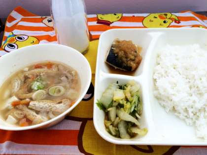 今日の給食では、さといも・とうふ・れんこんなどを油でいため、だし汁を加えて煮、しょうゆで味をつけています。