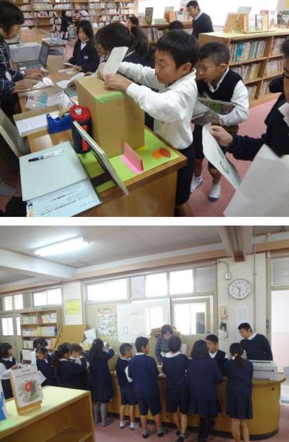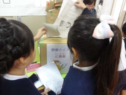 たくさんの子どもたちが図書館を訪れ、“読書クイズ”の箱に我先にと答えを入れ,
