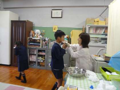歯科校医さんと歯科衛生士さんが来られ、4年生がフッ化物塗布をしました。