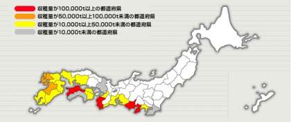 1番たくさんとれるのは和歌山県で16万トンとれます。 愛媛県、静岡県、熊本県、長崎県、佐賀県もたくさんとれます。