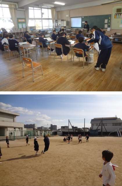 その後、各教室に分かれて授業を参観し、また、担任のお手伝いや給食や掃除の補助などを経験しました。昼休みには、運動場で子どもたちと元気いっぱい走り回っていました。最後は、2日間の振り返りをし、校長先生・教頭先生にあいさつして帰りました。