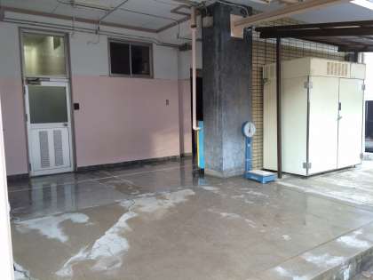 給食室の近くに、大きな冷蔵庫があります。