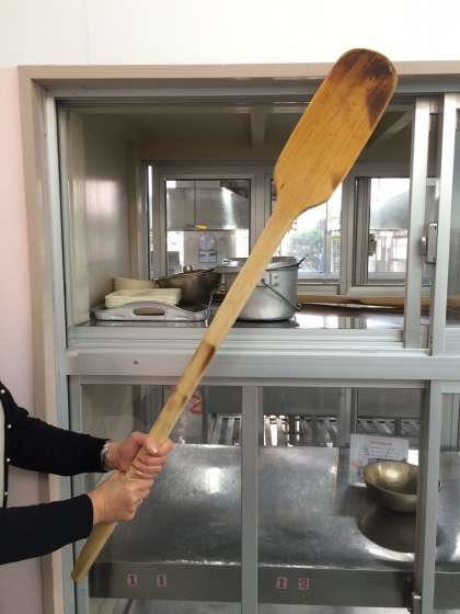 写真は給食調理員さんが調理の時に試用する大きなしゃもじのようなもの(木櫂)です。