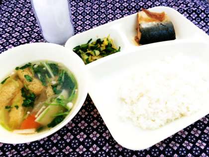 さばのみそ煮 五目汁 きくなとはくさいのおひたし