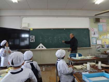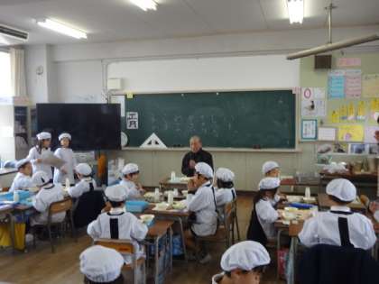 今日から給食週間が始まりました。今日は薬剤師の佐々木先生といっしょに1年生が給食を食べました。 「まごにやさしい」と黒板に書かれ、体にいい食べ物のリストを教えてくださいました。(まめ・ごま・わかめ・やさい・さかな・しいたけ・いも)