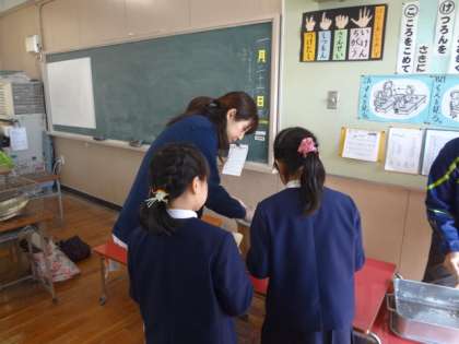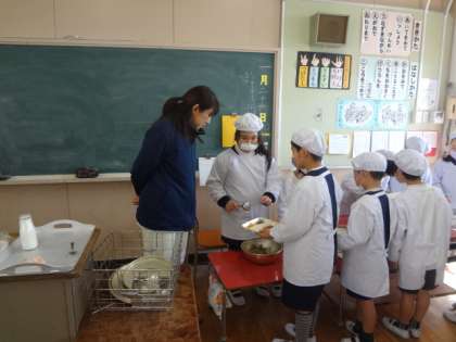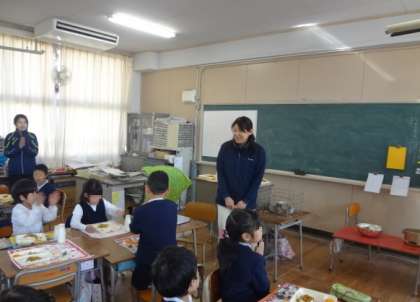給食週間の三日目。今日は給食調理員の成尾さんといっしょに2年2組の子どもたちが給食を食べました。「いただきます。」の前には、全員で「いつもありがとうございます。」とお礼を言いました。子どもたちの配膳の様子を見守ってくださり、カレーのおかわりを入れることもしてくださっていました。