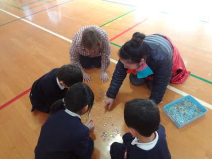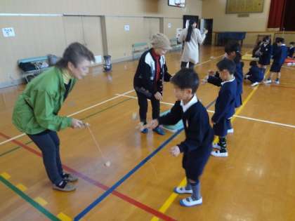 あやとり・コマ回し、おはじき、竹とんぼ、羽根つき、けん玉、だるま落とし、メンコ、お手玉など、普段あまりしない遊びを教えていただき、子どもたちはとても楽しんでいました。途中の休憩時間には、子どもたちは肩たたきでお礼をしていました。