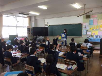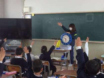 1年生が大きな時計を使って、時刻の読み方を学習しています。
