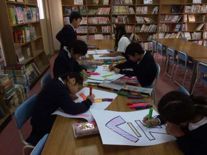 図書委員会では講堂の舞台に掲示する“ありがとう集会”の文字をかいています。