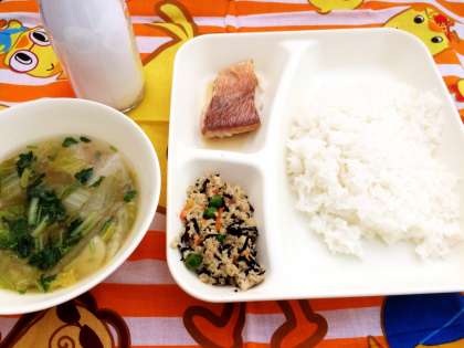 今日の給食では、「赤魚のレモンじょうゆかけ」のたれに、給食室でしぼったレモン果汁を使っています。