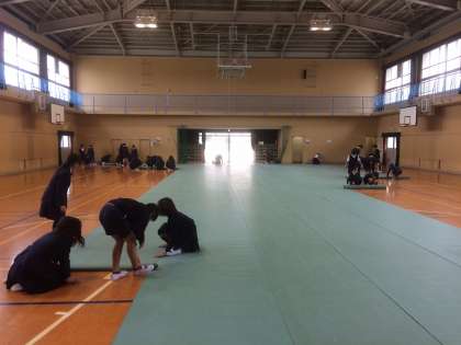卒業式に向けて、5年生が講堂の床にシートを敷きました。