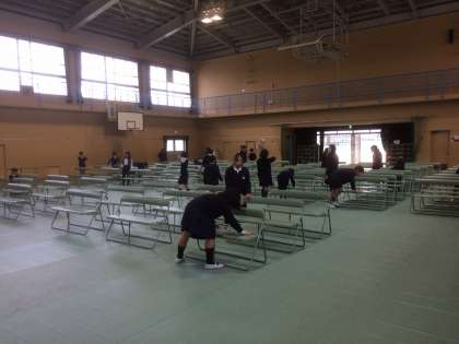 重いシートを協力して講堂の端に運び、しわがよったり、曲がったりしないように注意しながらシートをのばしていきました。いす並べやひな壇の設置、そして、椅子の雑巾がけまで約1時間で完了する驚きのスピード作業でした。