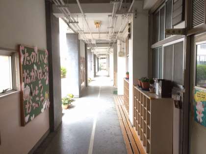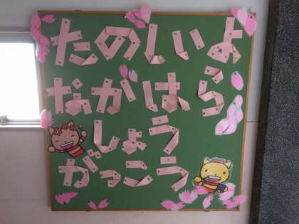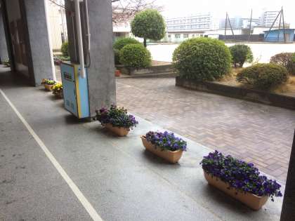 保健室前の掲示です。1階の廊下には、きれいな花が植わったプランターが並べてあります。