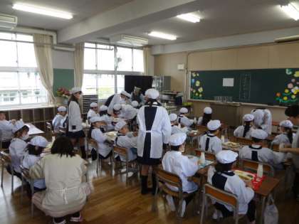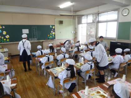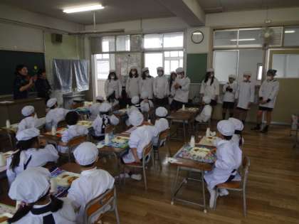 1年生のなれない給食準備を手伝うために、6年生のお兄さんやお姉さんたちがお手伝いに来てくれました。配膳の手伝いだけでなく、牛乳のふたを開けることまで手伝ってくれました。