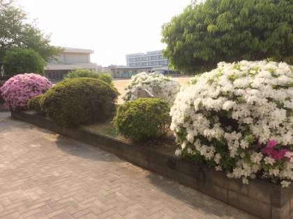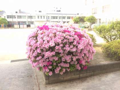校庭横の花壇には、ヒラドツツジがきれいに咲いています。(木の全体はおわんを伏せたような形をしています)