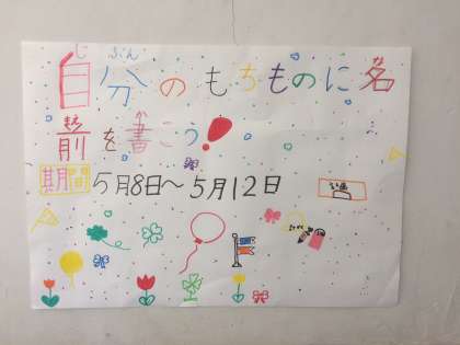 ※「自分のもちものに名前を書こう。」というポスターが校舎内のろう下にも貼られています。