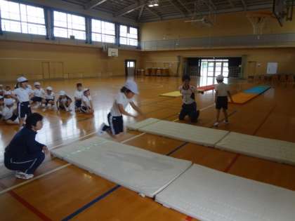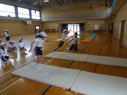「大きく手を振って……」 本番前に先生から跳び方の指導を受け、一度練習をしてから跳びました。