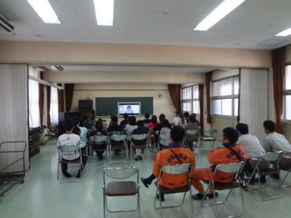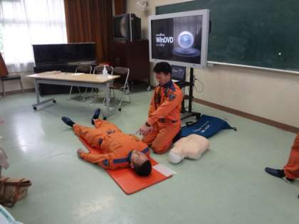 最初にビデオを視聴し、その後、消防隊の方が救急救命法(胸骨圧迫・人工呼吸・AED使用手順など)の実演してくださいました。