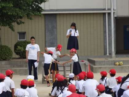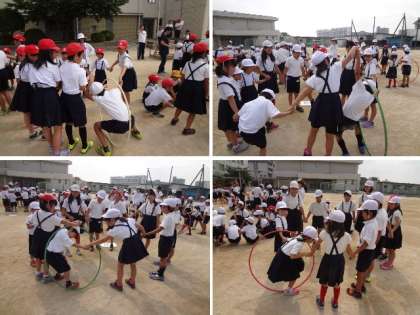 班ごとに輪になって手をつなぎ、手をはなさないで班長から順番にフラフープをくぐっていきました。みんなで声かけしながら、楽しく活動していました。