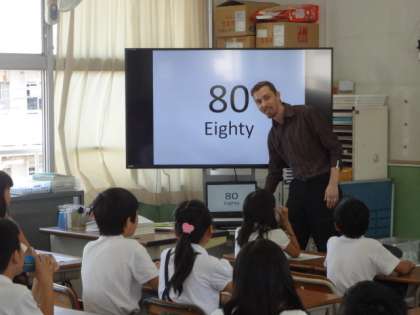 あいさつの仕方を復習した後、たくさんの絵や記号が書いてあるプリントを見ながら、“How many 〜(いくつある)?”を答えました。