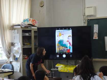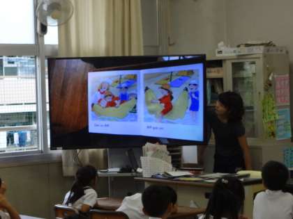 今朝の低学年は、英語の絵本の読み聞かせがありました。