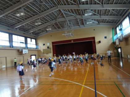 放送が入ってから各クラスが講堂に移動しました。先に到着した高学年児童がプレートを掲げ、後から来た低学年児童を導きました。