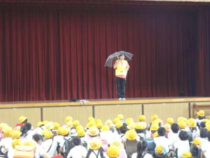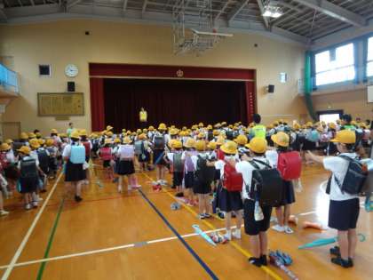 「集団下校訓練を行います。暴風の中集団下校する訓練です。お(おさない)、は(はしらない)、し(しゃべらない)、も(もどらない)に注意して移動しましょう。」