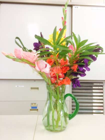 緑化推進委員の濱野さんが長原ガーデンで育てておられるグラジオラスを、職員室に飾ってくださいました。グラジオラスにたくさんの色の種類があることに驚きます。