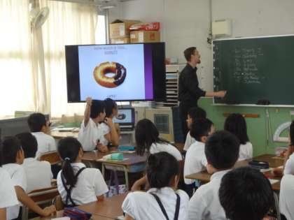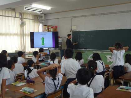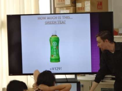 大型黒板に映し出された品物の値段をチームで考え、英語で当てる(近いチームが勝ちの)ゲームでした。今までに習った大きな数(hundred:百など)を使って答えを言い、楽しみながら数字の言い方を復習していました。