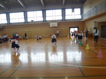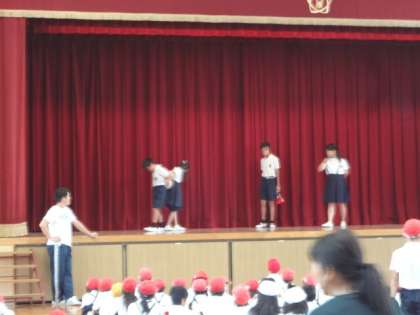 今日のスマイル集会は、講堂での“背中でボールはさみリレー”でした。