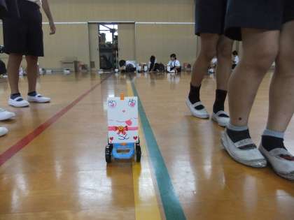 ゴムの力で講堂の端まで“実験の車”が走っていったことにとても驚いている子がいたり、「がんばれ、がんばれ」と車の横を応援しながら歩いている子たちもいました。