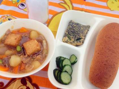 今日のヒラヤーチーの具には「にら」と「もずく」が使われています。