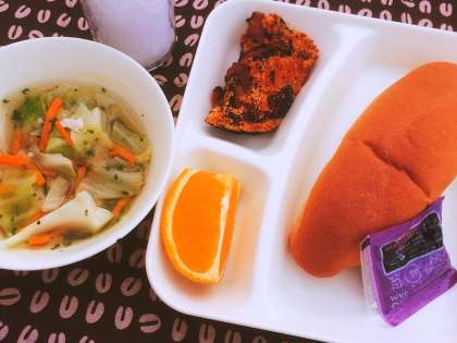 7月5日(水) かぼちゃのミートグラタン スープ オレンジ ブルーベリージャム パン 牛乳
